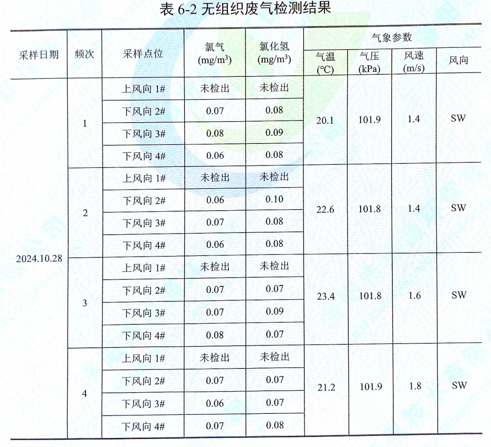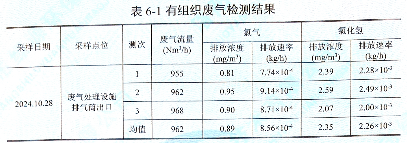 由上表可知,有组织废气和无组织废气中Cl2和HCl排放浓度均达标。